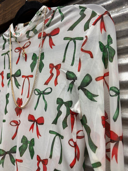Get trendy with the Keigan Mesh Top- Midnight Bow Christmas Edition! This playful top features lettuce hems, a mock neckline, and a sheer mesh material that can be layered under or over any outfit. Don't miss out on this holiday revamp of our beloved Midnight Bow print!