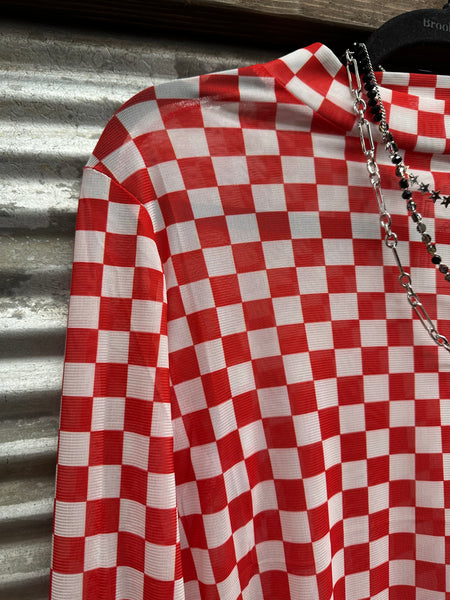 Get ready to stand out at your next pep rally with this quirky and playful red and white checked mesh top! Featuring a unique design, this top will bring some fun and excitement to your game day outfit. Show off your team spirit in style with the Pep Rally Mesh Top.