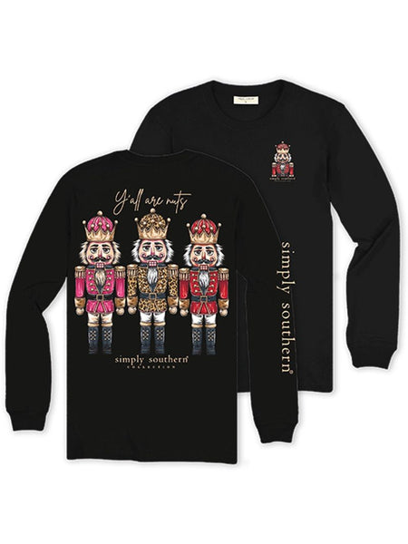 Black long sleeve shirt with the phrase 'Y'all are nuts' and a trio of nutcrackers. Simply Southern logo below, on left chest, and along right sleeve. 100% cotton. Unisex sizing.