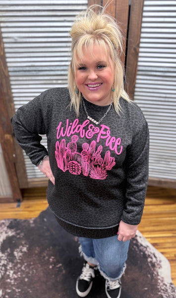 Embrace your wild side with this cozy leopard sweatshirt featuring bold hot pink puff lettering that spells "Wild & Free." The playful cactus accent adds a southwestern flair that's perfect for anyone who loves standing out. Soft and comfortable, this statement piece pairs effortlessly with your favorite jeans or leggings for a look that's both fun and effortlessly chic. Express your free spirit in style.
