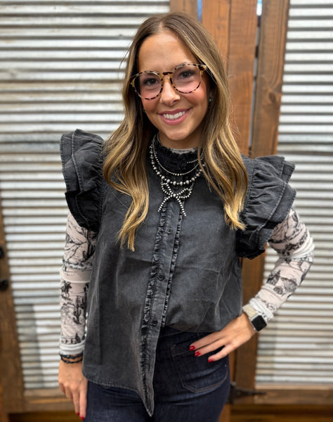 Elevate your fall wardrobe with the "Fall Flutter Tank" in an acid wash black. Featuring delicate washed ruffle trim and flutter sleeves, this blouse offers a soft, feminine silhouette perfect for layering or wearing alone. Its lightweight, breathable fabric ensures comfort all day, making it an effortless choice for seasonal style and casual elegance.