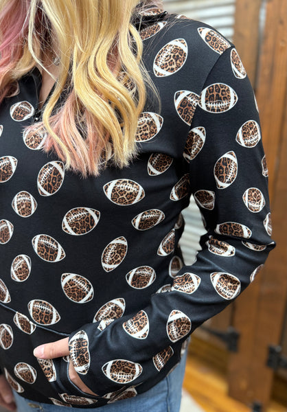 Stay cozy and stylish with the Girls Of Fall Pullover, featuring a trendy quarter zip design and a convenient kangaroo pocket. Adorned with playful leopard print footballs, this pullover adds a fun, sporty edge to any outfit. Perfect for crisp autumn days, it combines comfort and flair to keep her warm and confident all season long.