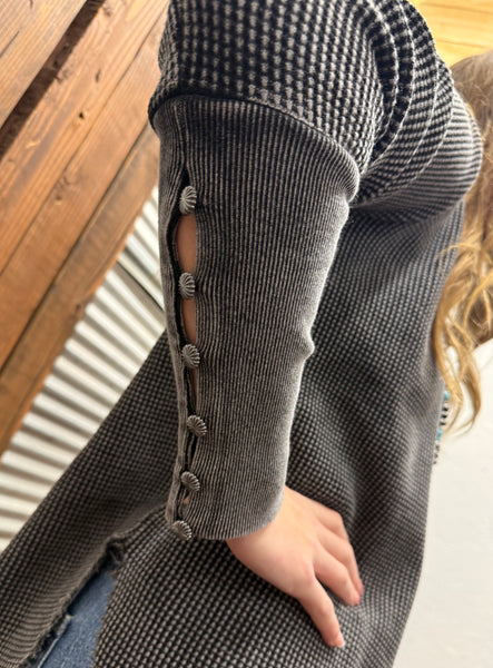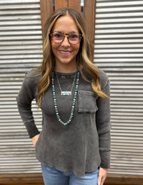 it has the stretch and comfiness of a basic top BUT more details. the texture. the color... it will take a casual outfit up 10 notches. it has our small concho buttons on the cuff - which is a extended pico top like cuff. it all has a front pocket for an extra detail.