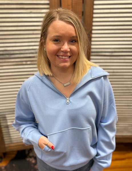 Kayla Luxe Hooded Quarter Zip Pullover- Light Sky Blue