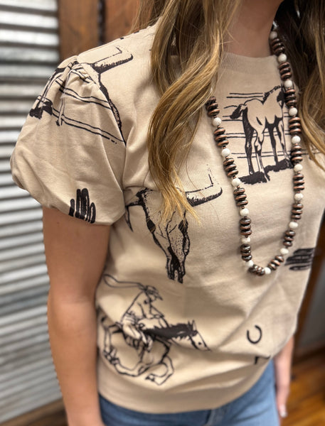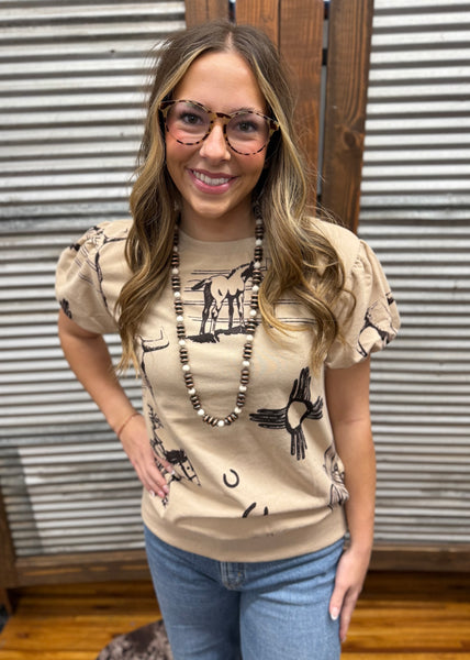 it's 100% cotton and giving all the western feels. this top has some girliness with western graphics. we are loving the puff sleeve details. there is a band at the bottom that can be tucked in to hide or rock it with the band out.