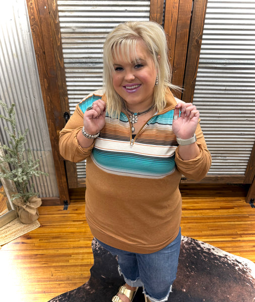 Built for comfort and made to stand out, the Herdsman Half Zip features a warm camel base with a classic serape print across the top in brown, turquoise, and cream. The half zip design makes it easy to layer, while the soft yet durable fabric is ready for long days, cool nights, and everything in between.